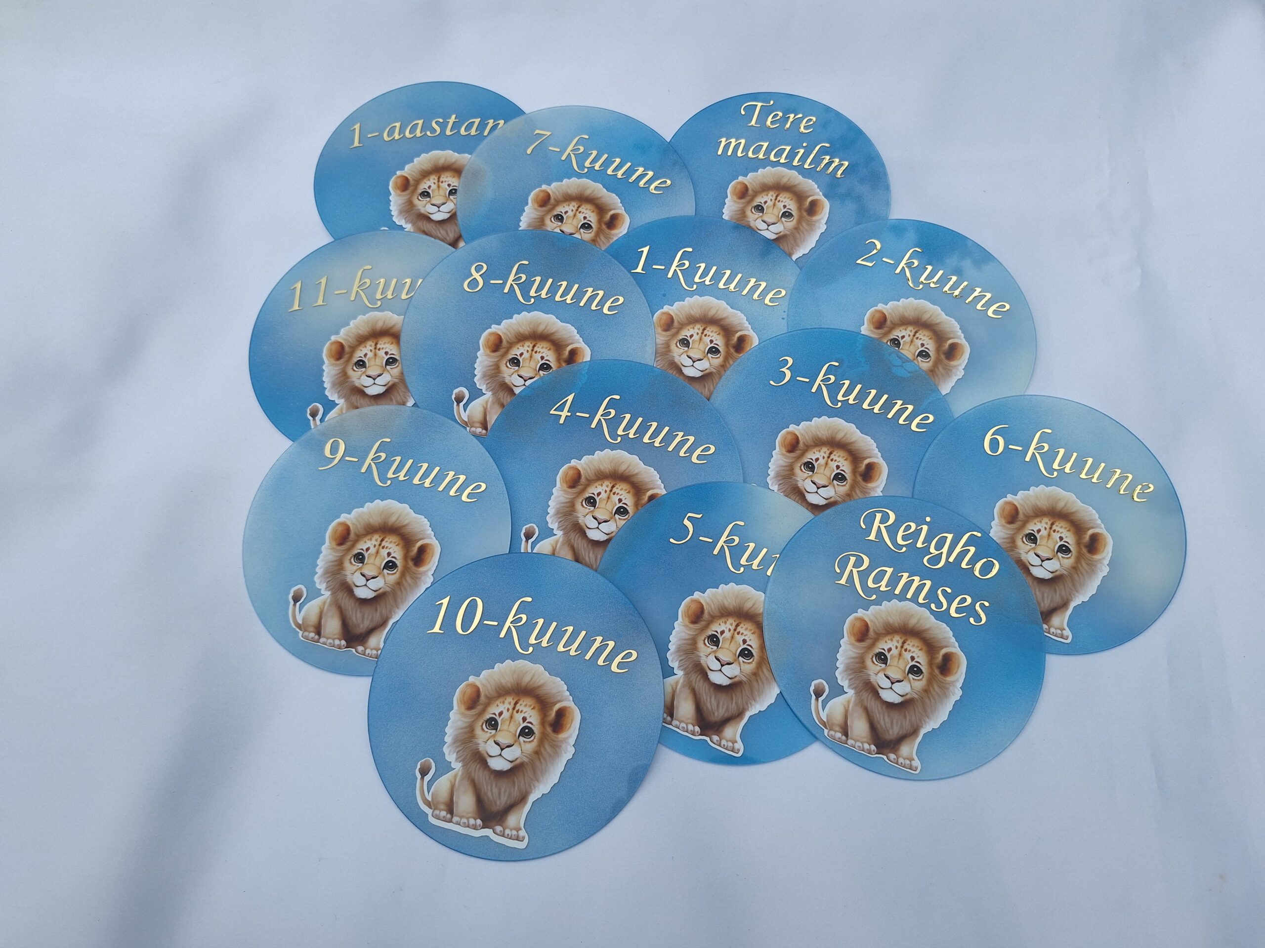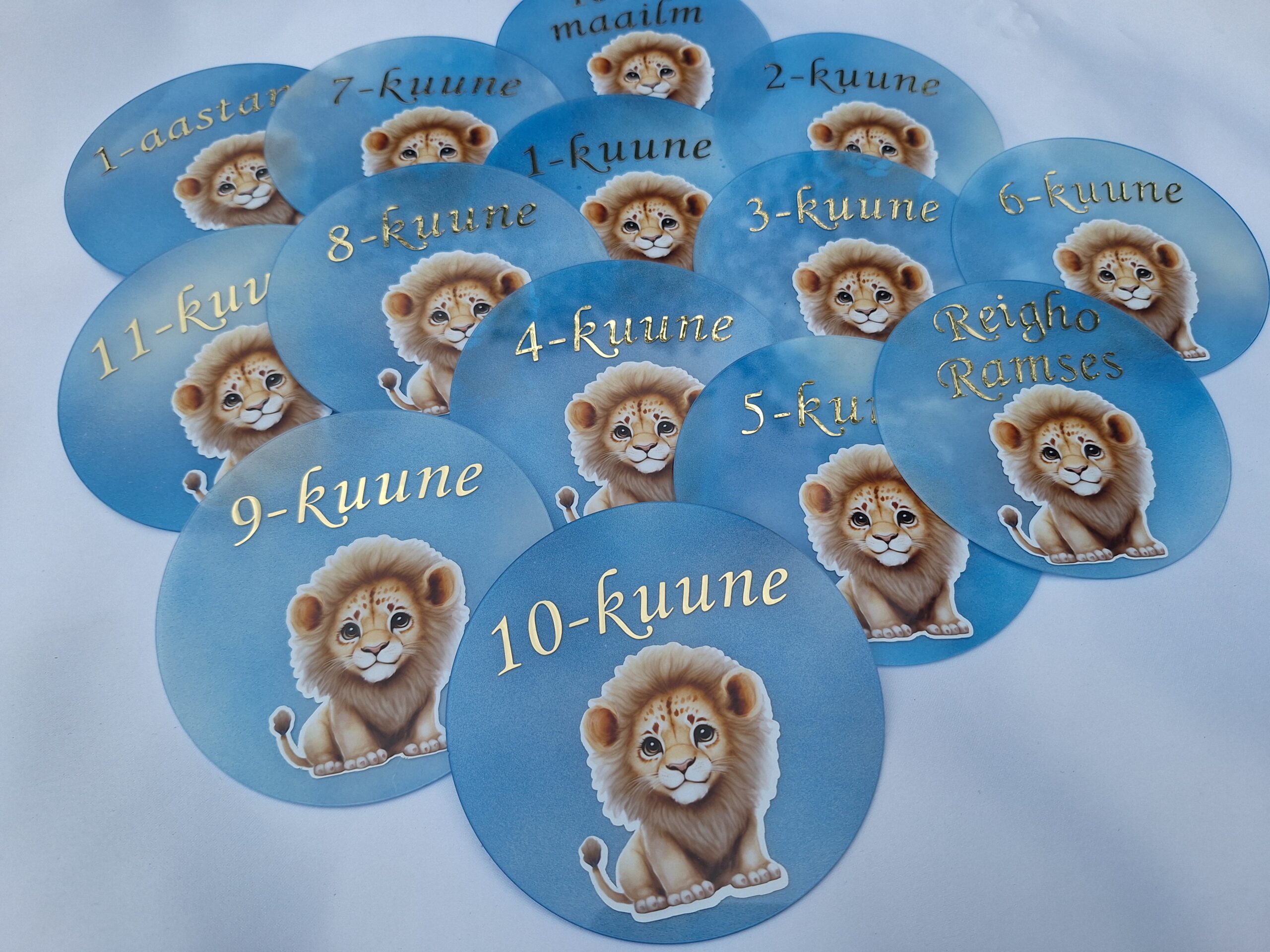 Komplekti kuulub 12 kuukaarti (1 kuu kuni 1 aasta), lisaks lapse nime ja soovi korral ka sünnikuupäevaga kaart.